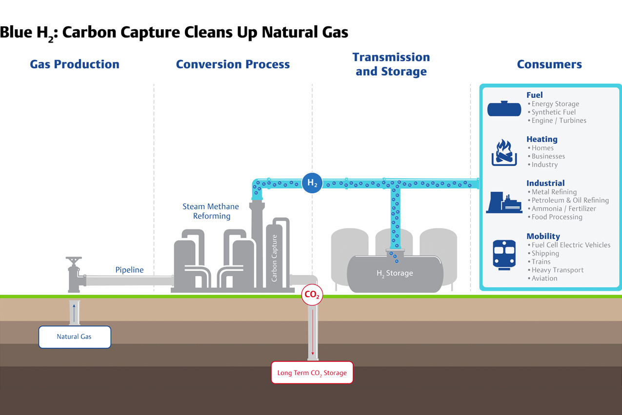 스팀 메탄 개량 공정은 3단계로 나뉩니다. 첫째, 천연가스는 증기 및 압력, 촉매와 반응하여 수소 및 일산화탄소, 소량의 이산화탄소를 생성합니다. '물-가스 이동 반응'으로 알려진 다음 단계에서 증기와 일산화탄소는 촉매와 반응하여 이산화탄소 및 더 많은 수소를 생산합니다. 최종 단계에서 이산화탄소 및 기타 불순물을 제거하는 '압력 스윙 흡착' 과정을 통해 순수 수소가 생성됩니다. 기존의 그레이 수소 생산 공정에서는 폐이산화탄소를 대기 중으로 방출합니다. 반면 블루 수소를 사용하면 대부분의 이산화탄소 분자를 포집하여 지하로 보내 장기간 저장합니다.