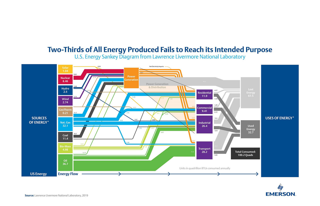 가스나 석탄과 같은 화석 연료에서 생산되는 에너지의 일부인 손실 에너지는 석탄 화력 플랜트, 자동차 엔진, 전구에서 발생하는 열처럼 폐열 형태로 버려지거나 낭비됩니다. 연구에 따르면 어느 산업용 플랜트에서든 투입되는 에너지의 3분의 2(약 67.5%) 가량이 열 교환기 오염, 연소 컨트롤 불량, 압축 공기 시스템 누출, 스팀 트랩 고장 등으로 인해 본래 용도로 사용되지 못하고 손실됩니다. Emerson의 제조 시설이나 자동차, 전구의 효율성은 폐열 발생량과 생산적으로 이용할 수 있는 연료 및 전력의 양을 결정합니다.