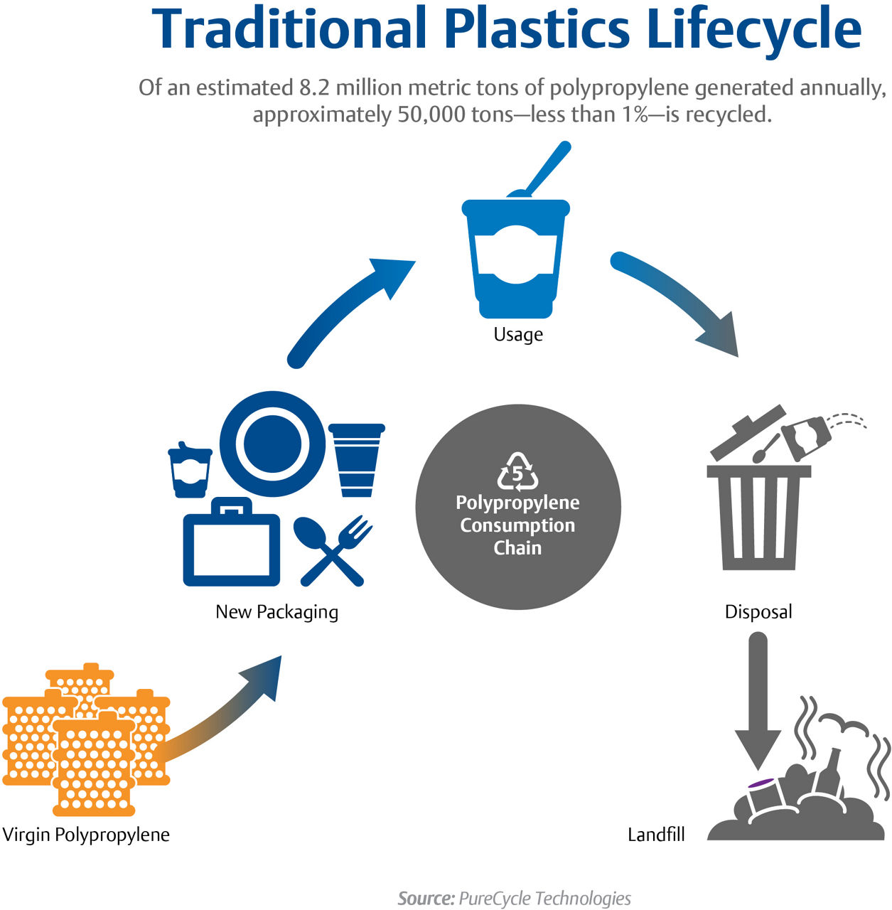실제로 매년 생산되는 폴리프로필렌 플라스틱의 1,700억 파운드 중 1% 미만이 재활용 및 재사용됩니다. 이는 세계에서 가장 다양하게 활용할 수 있으며 널리 사용되는 플라스틱을 더 효과적으로 재활용하여 순환 경제에 도달할 엄청난 기회가 있다는 것을 의미합니다. 순환 경제는 제품 수명이 다한 후 자원을 회수하여 다시 생산에 투입하여 생산물이 환경에 미치는 영향을 최소화합니다. 특히 기존 생산물을 재활용하고 재사용하는 경우의 주요 목표는 탄소 생산량을 줄이는 것이기도 합니다.