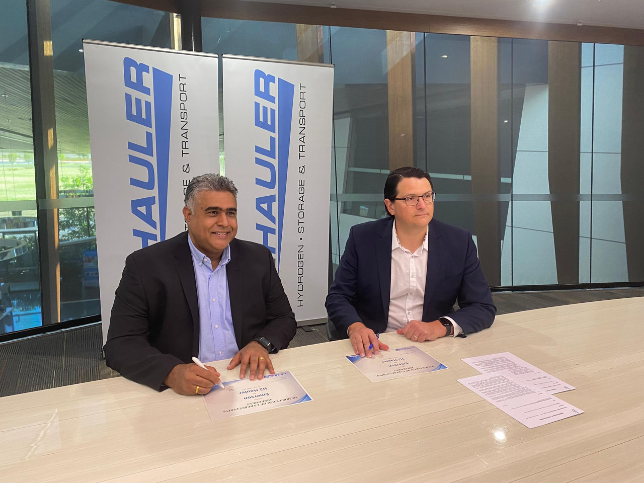 Emerson의 오스트레일리아 및 뉴질랜드 담당 부사장 Boris Gabin(왼쪽)과 H2 Hauler의 CEO Tyson Cooney가 통합 수소 모빌리티 기술 제공 계약을 체결하면서 서명하고 있습니다. 고해상도 이미지